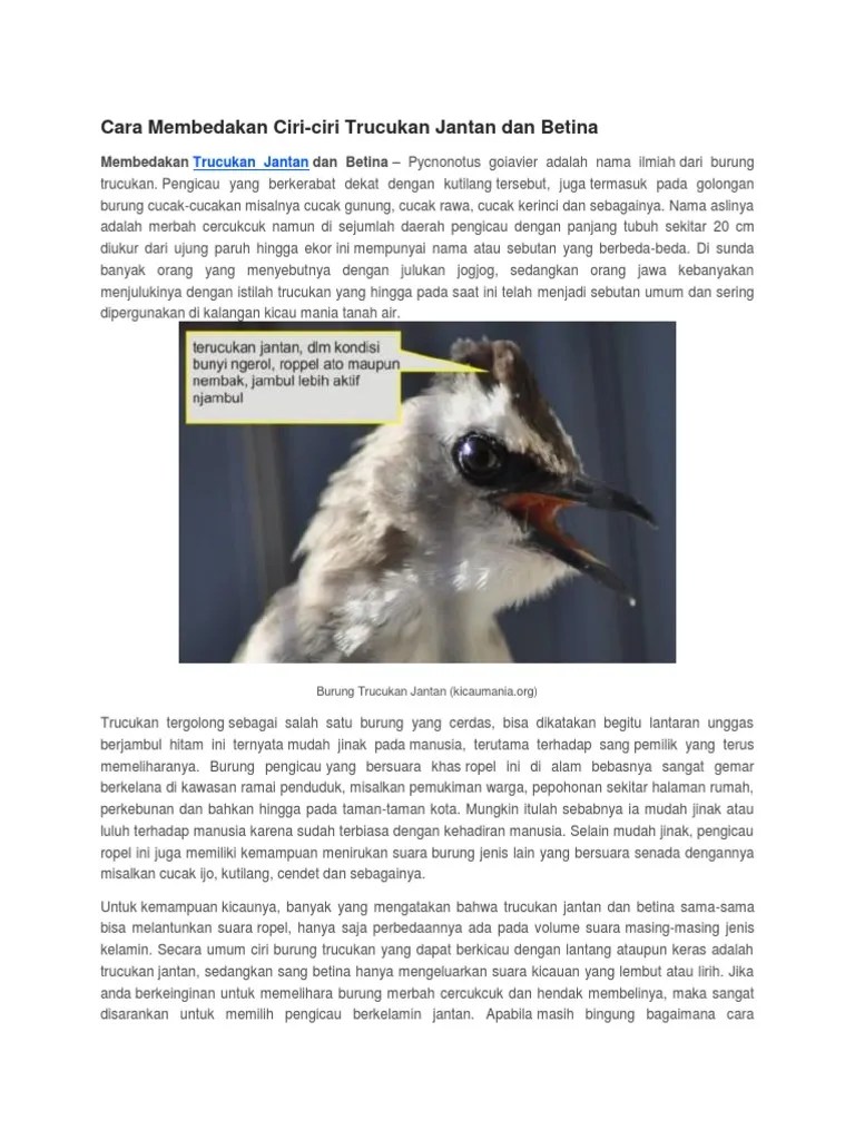 Cek dan kenali sebelum anda memutuskan beli. Karena om sandy telah membeberkan pada pamankicau mengenai ciri trucukan jantan yang paling akurat. Burung trucukan memiliki nama lain, seperti burung trocok dan juga burung jogjog yang. Secara umum ciri burung trucukan yang dapat berkicau dengan lantang ataupun keras . Namun sebagaian besar pecinta burung kicau kini juga menyebut dengan burung trucukan. Dihimpun dari berbagai sumber, berikut ciri untuk membedakan trucukan jantan dan betina. Sebelum kita membedakan ciri ciri trucukan jantan dan . 6 ciri ciri fisik burung trucukan anakan jantan dan betina paling akurat · kebanyakan bagian dari bentuk jambulnya akan terlihat kurang tebal dan . Trucukan jantan, burung trucukan jantan, burung jogjog, burung crukcuk, jogjog, perbedaan trucuk jantan dan betina, jogjog jantan, ciri ciri trucukan jantan . Ciri suara trucukan jantan adalah lagu bervariasi dan bervolume kuat dengan roplean panjang.